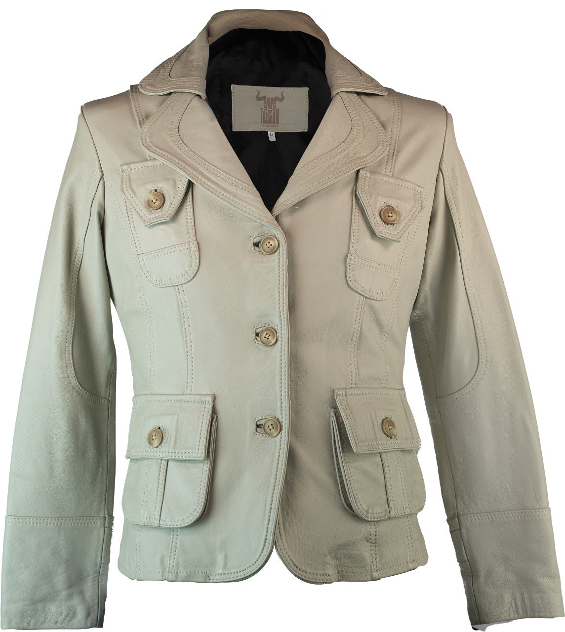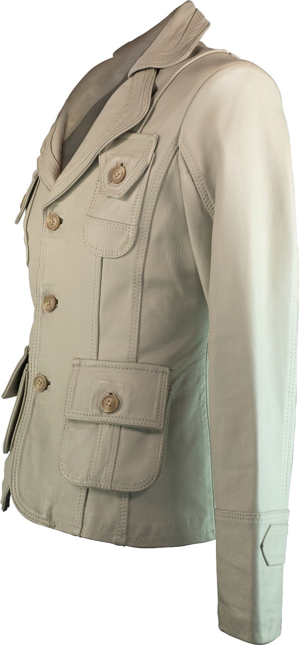 Descripción: Chamarra estilo académico refinado retro en tonos neutros, con corte slim y cierre con botones.