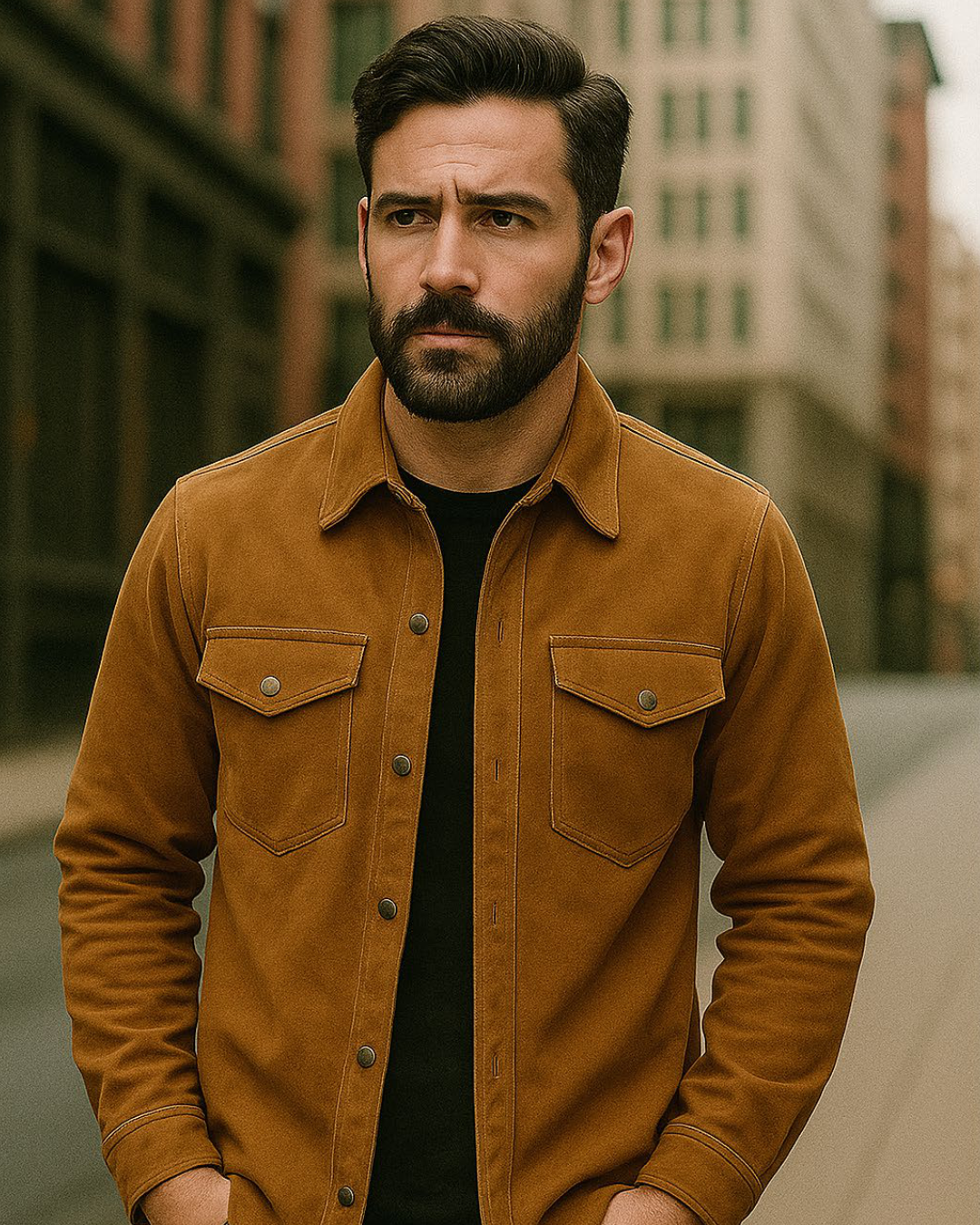 Descripción: Cubre-camisa de inspiración aventurera de tipo casual o vaquero con bolsillos funcionales a la altura del pecho. En fino Ante, tacto aterciopelado.